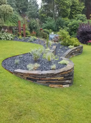 Die zugehörigen Flächen sind mit graulaubigen , niedrigwachsenden Stauden bepflanzt. Die Fläche ist mit Schiefersplitt abgedeckt. Im Hintergrund ein Brunnen aus corten Stahl.